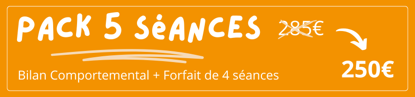 Pour un Pack complet (bilan + forfait), si vous ne souhaitez pas régler l’intégralité lors de la réservation de la première séance, vous pouvez réserver via une séance “Bilan Comportemental” au tarif de 85€.